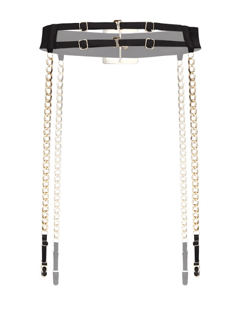 • quipped with adjustable holders for stockings and gold-colored buckle decoration